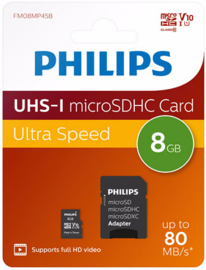 Philips FM08MP45B/00. Capacidad: 8 GB, Tipo de tarjeta flash: MicroSDHC, Clase de memoria flash: Clase 10, Tipo de memoria interna: UHS-I, Velocidad de lectura: 80 MB/s, Clase de velocidad UHS: Class 1 (U1), Clase de velocidad de vídeo: V10. Color del producto: Negro, Blanco
