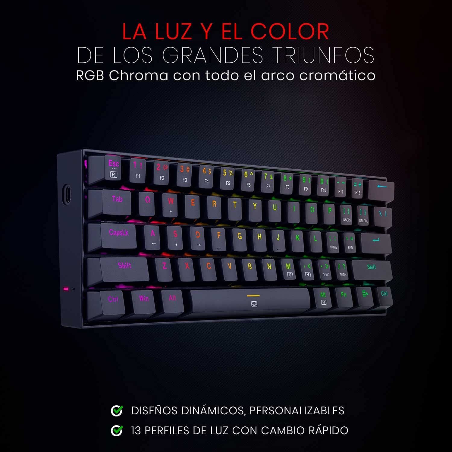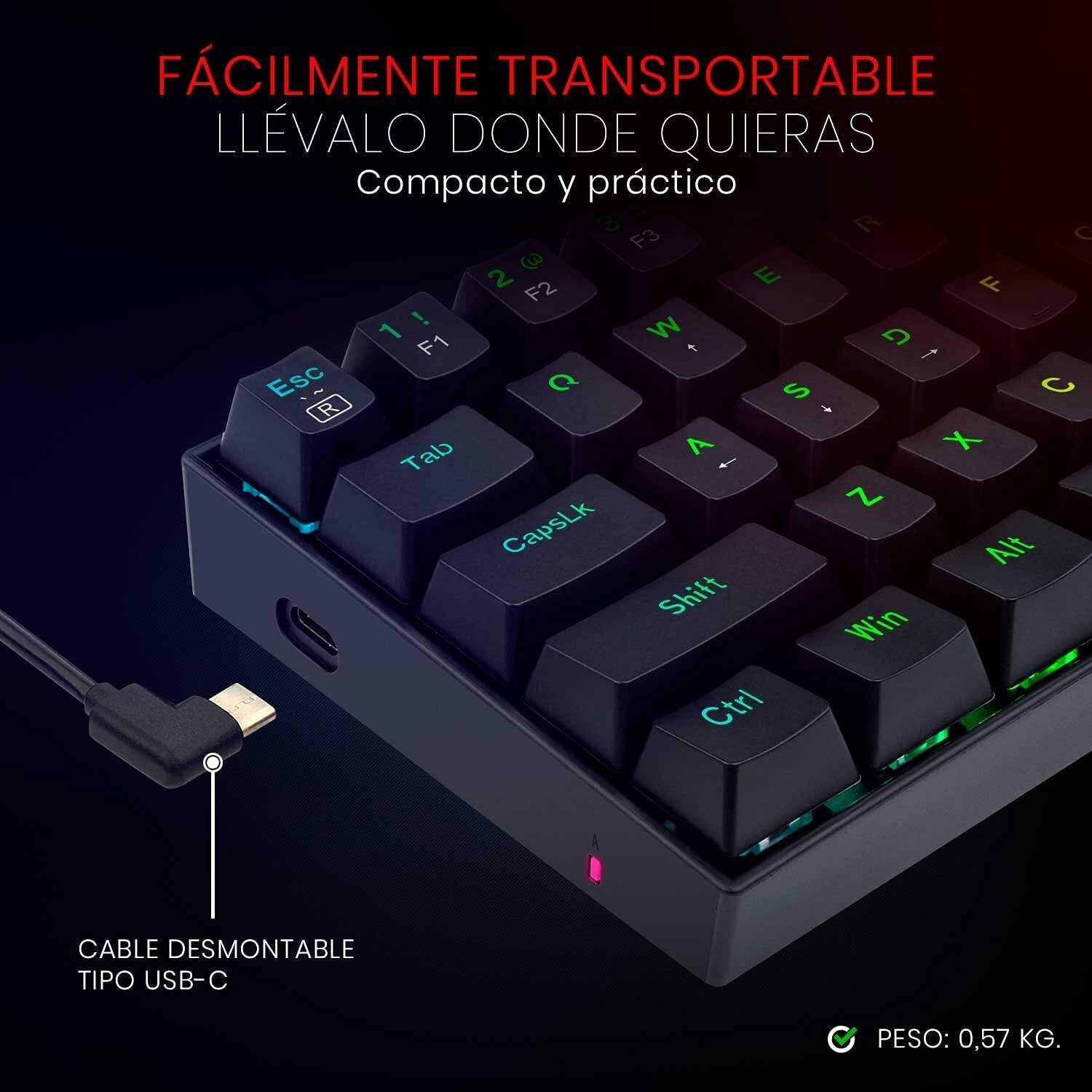 Dragonborn RGB K630.Tamaño 60%. Poder 100%.Pequeño, pero temible. El Dragonborn es un teclado mecánico 60%, compacto y súper transportable, con prestaciones óptimas para el juego competitivo de alto nivel: switches Redragon Brown, tecla Fn, bloqueo de tecla de Windows, cable desmontable y la mejor calidad de construcción. Más la debida iluminación RGB, por supuesto..Preciso y silencioso.Los Redragon Red son switches equilibrados, con distancia y fuerza de actuación medianas. Además son táctiles: ofrecen una pequeña resistencia (perceptible al tacto, pero casi inaudible) que confirma la pulsación. Ágiles, precisos y silenciosos, estos switches hacen del Dragonborn un arma de temer. .Asimismo, son intercambiables (hot swap) por otros switches Redragon. .Práctico.El cable es de tipo USB-C, y es desmontable. Esto, sumado al diseño compacto y robusto, le da al Dragonborn un carácter realmente práctico: es posible transportarlo para la utilización en distintos dispositivos (o para cualquier otro fin) de manera muy fácil, rápida y segura..Un verdadero jugador.Las 61 teclas del Dragonborn son plenamente anti-ghosting; la tecla de Windows se bloquea y desbloquea fácilmente; los 13 presets de retroiluminación están disponibles para cambios al vuelo, a través de tecla Fn. Adicionalmente, el software dedicado permite la personalización plena de sus funciones. No lo dudes, este pequeñín es un verdadero jugador. .Especificaciones técnicas.Tipo de teclado: mecánico..Tipo de switches: Redragon Red (táctil sin clic audible, 45 g de fuerza de actuación).Teclas multimedia: no..Teclas macro dedicadas: no..Bloqueo de tecla Windows: sí..Tamaño: compacto 60%..Reposamuñecas: no..Retroiluminado: sí, RGB Chroma..Cable: USB-C desmontable..Matriz: 61 teclas full rollover..Construcción: plástico ABS reforzado..Anti salpicaduras: sí..Distribución: inglés.Peso: 0,57 kg..Dimensiones: 29,17 x 10,17 x 3,6 cm. .Extras: -.Software: sí..