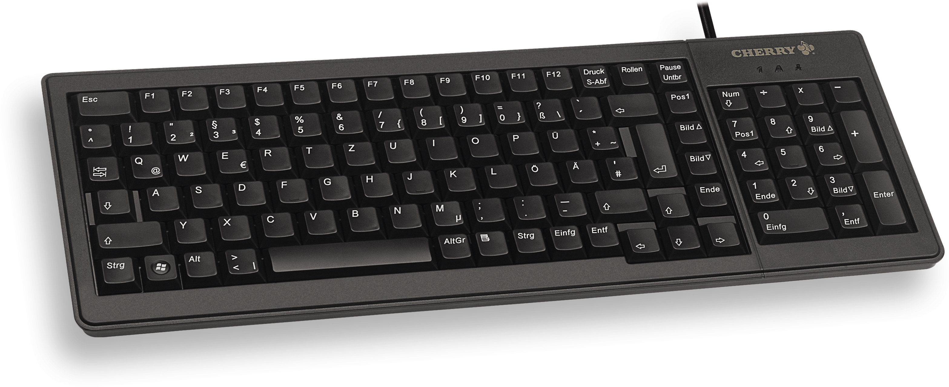 CHERRY XS G84-5200. Formato del teclado: Completo (100%). Estilo de teclado: Derecho. Tecnología de conectividad: Alámbrico, Interfaz del dispositivo: USB + PS/2, Interruptor del teclado: Interruptor mecánico, Diseño de teclado: AZERTY, Teclado, cantidad de teclas: 104. Longitud de cable: 2,5 m. Uso recomendado: Oficina. Color del producto: Negro
