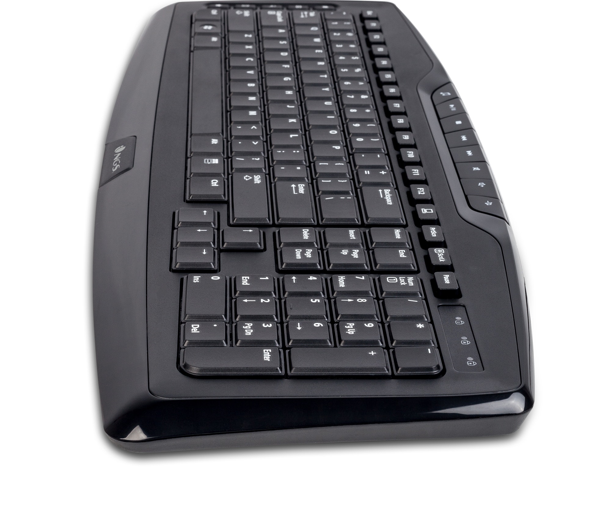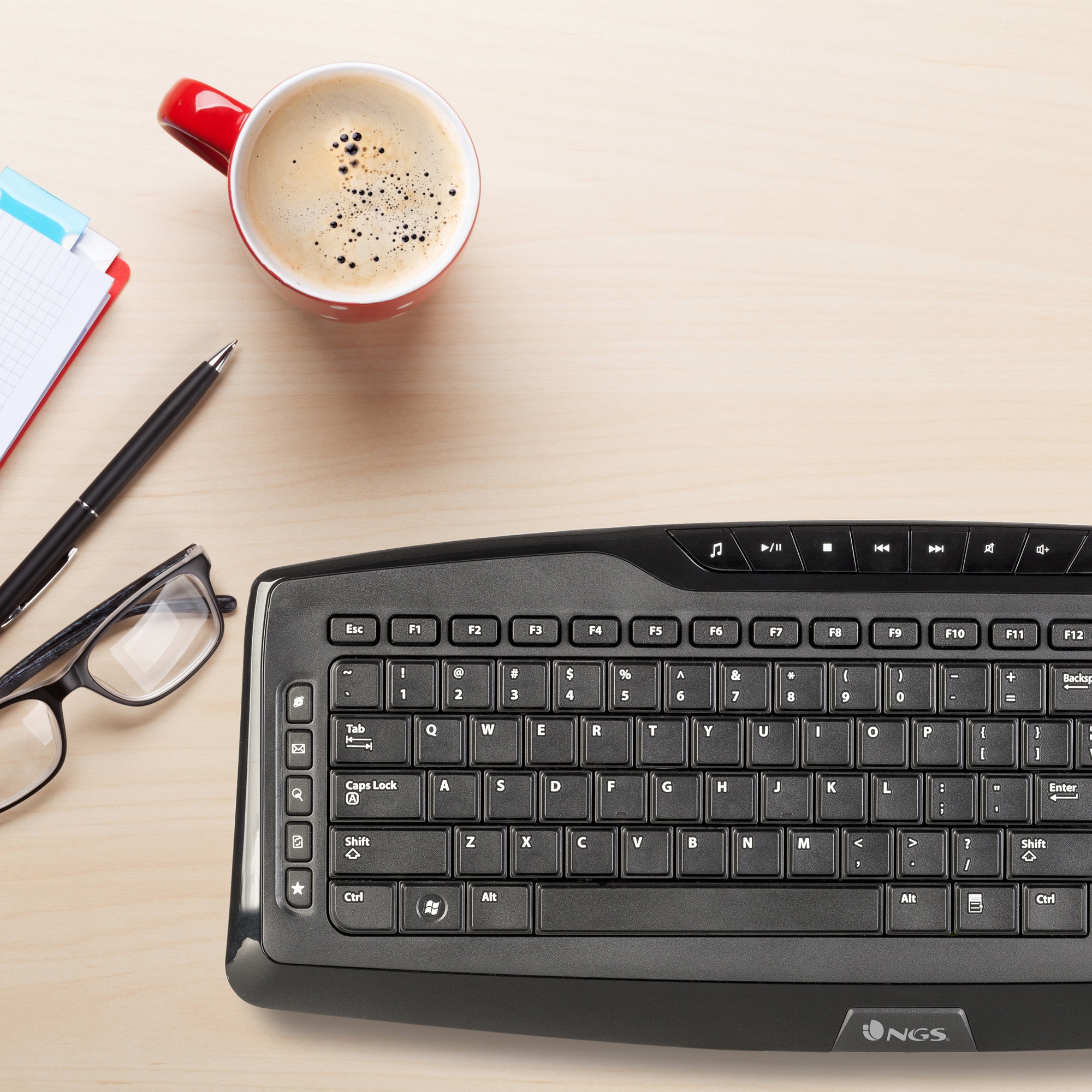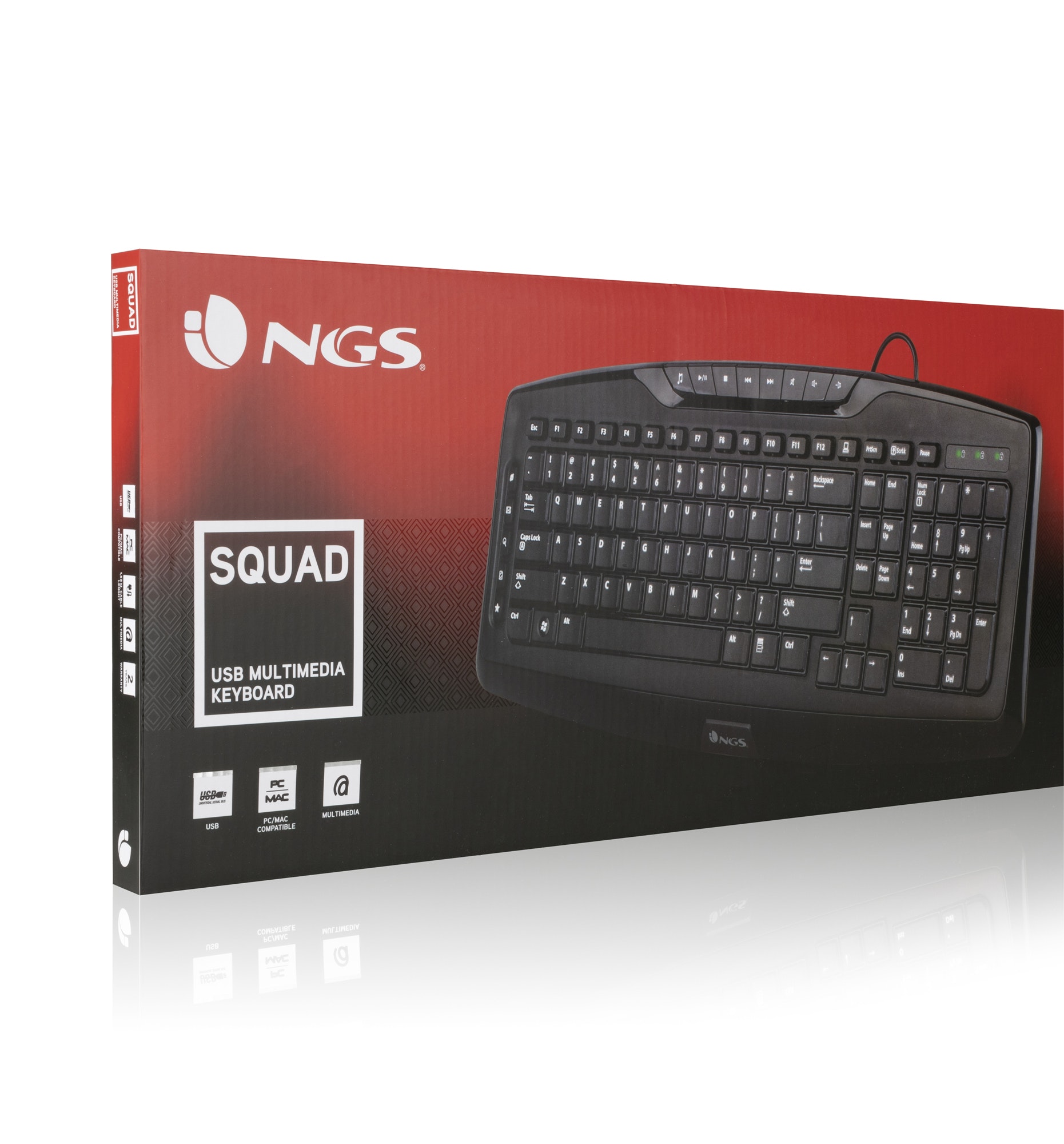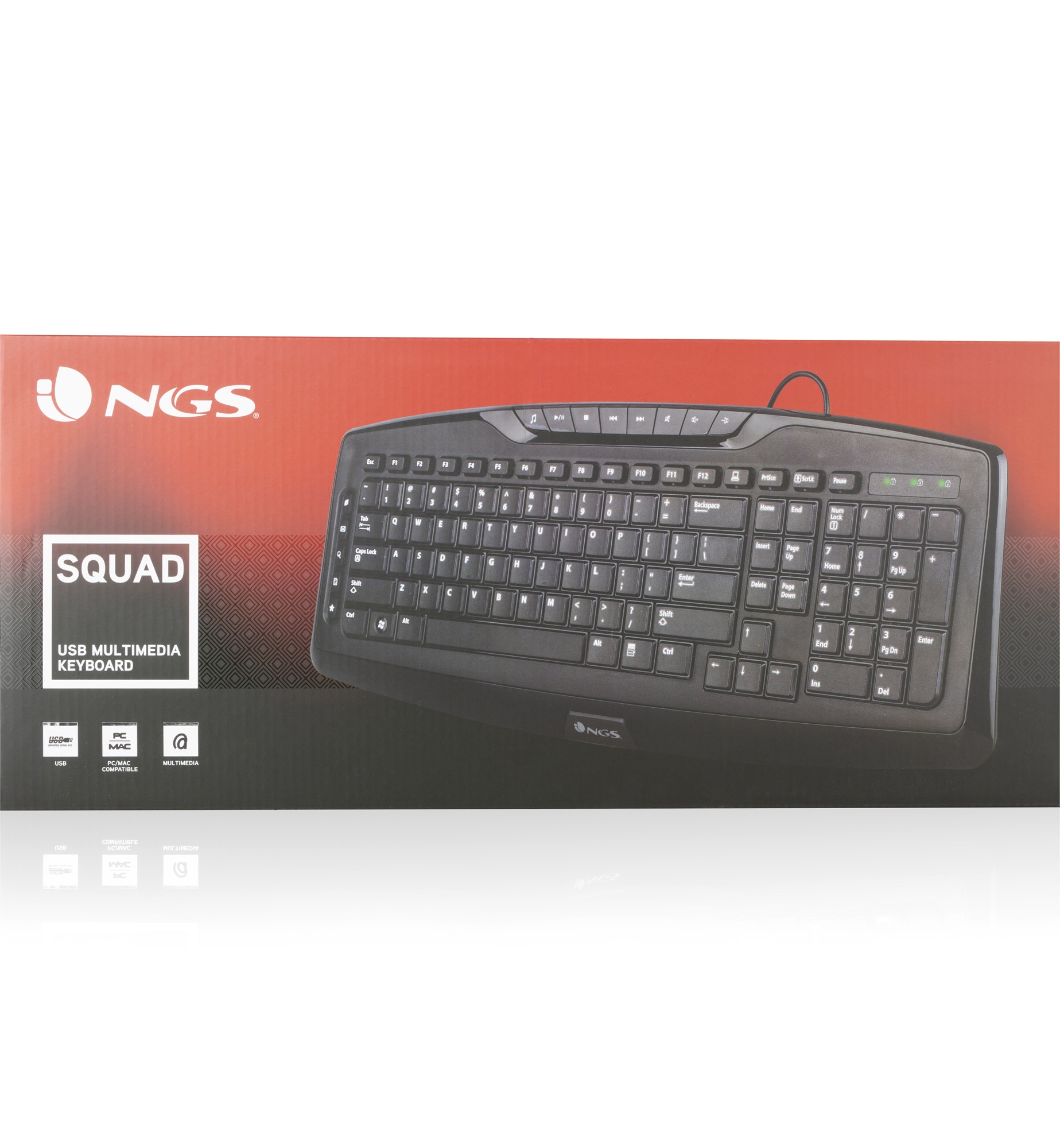 Organiza tu escritorio gracias a NGS Squad, un práctico teclado con conexión USB que cuenta con 8 teclas multimedia en la parte superior y 5 específicas para Office en el lateral. Dichas teclas hacen más fácil y rápido el acceso a las distintas aplicaciones del ordenador y sus habituales funciones.\n\nSu original acabado en color negro, combina mate y brillo, pura elegancia y personalidad.\n\nLa pulsación de las teclas de membrana es muy suave y el ruido que emiten al ser pulsadas es prácticamente imperceptible. Además, incorpora un diseño original resistente a los derrames, que ofrece un funcionamiento de mayor duración, aproximadamente de 10 millones de pulsaciones.\n\nSu capacidad de resistencia se debe a que sus teclas incluyen un tratamiento antidesgaste, evitando que se borren los caracteres y asegurando una larga vida.\n\nNGS Squad incluye soportes para regular el grado de inclinación, tacos grandes de goma en la base para un mayor agarre y un cable de 1,2 m de gran longitud para poder conectarlo cómodamente.\n\nPor último, NGS Squad tiene incorporada la función Plug & Play con lo que la conexión a cualquier equipo se realizará de forma inmediata.
