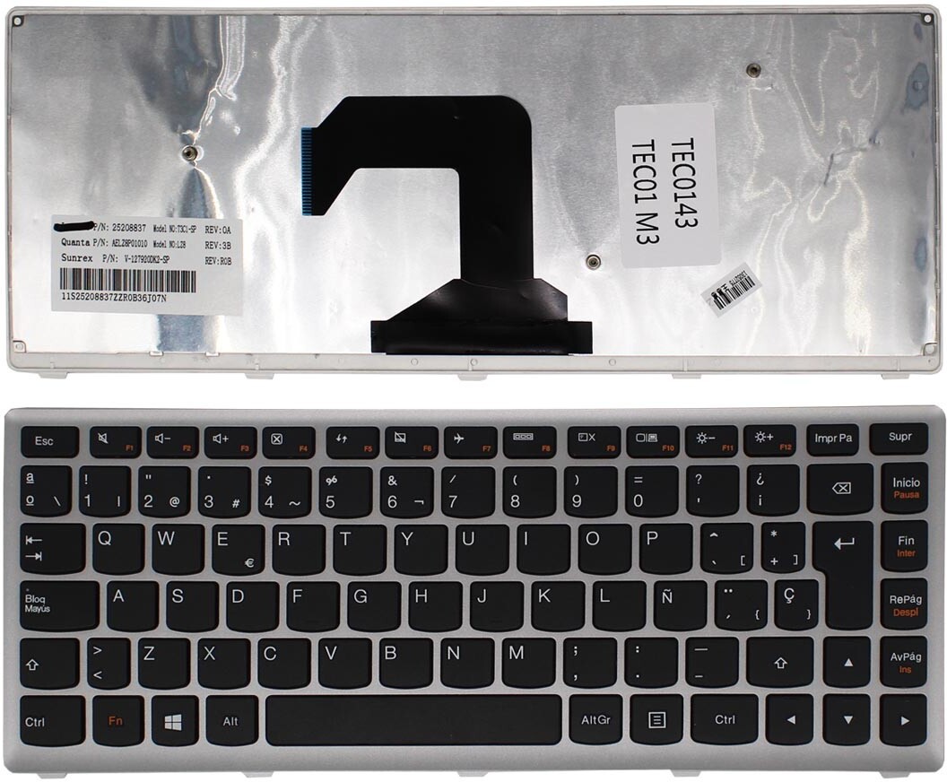 CARACTERÍSTICAS Teclado para portátil Lenovo Idioma: Español / Castellano Marco: Con marco Color: Plata (teclas en negro) Retroiluminado: No Modelos compatibles: Lenovo U410 Antes de comprar, por favor, asegúrese que el Teclado que necesitas es el que anunciamos. Para evitar errores y devoluciones compare el Teclado de su portátil con el Teclado que mostramos en las fotografías. En algunos casos pueden coincidir en el número P/N y no coincidir físicamente. Este Teclado para portátil es compatible con los modelos indicados (y más). El modelo completo de su portátil lo puede ver situado debajo del mismo. Si no encuentra el modelo de su portátil o no sabe qué Teclado es compatible, por favor, pregunte y le informaremos con mucho gusto.