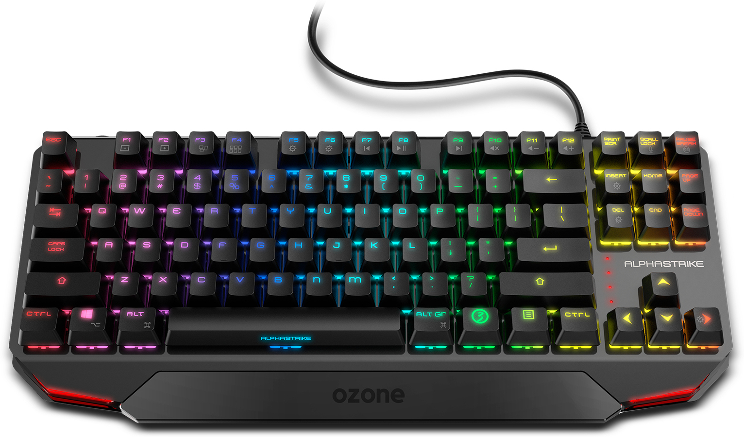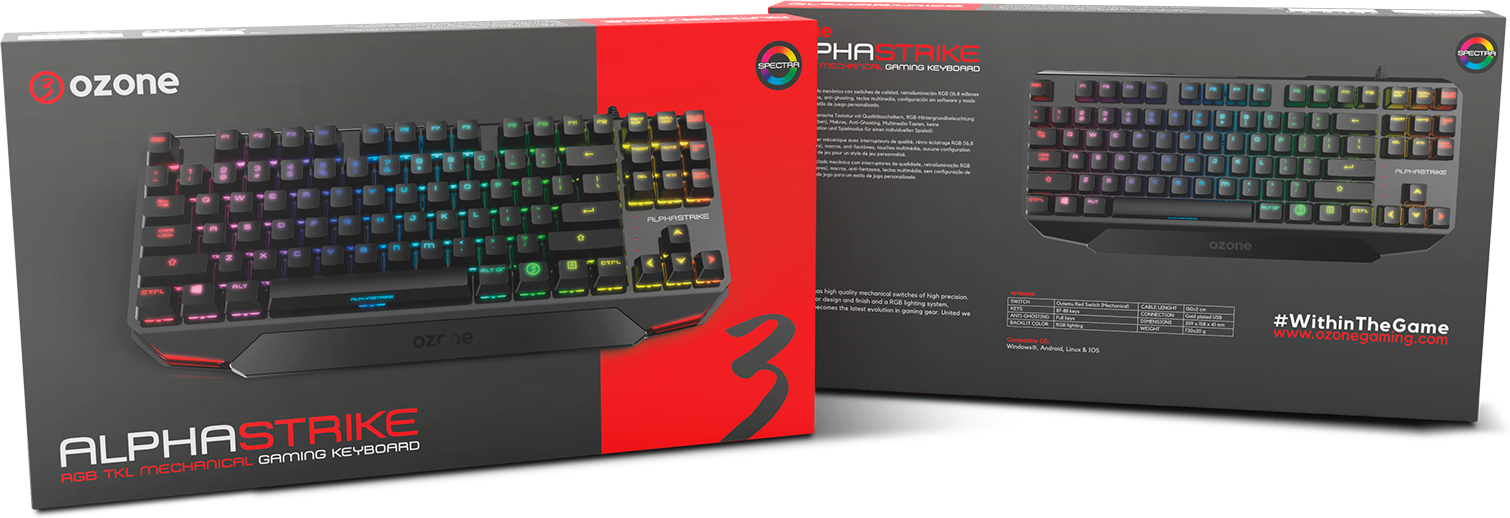 Alpha Strike es un teclado mecánico en formato TKL con los nuevos switches Red de Outemu.\n\nPresenta un diseño optimizado, súpercompacto y ligero que te garantiza libertad de movimientos y la seguridad en cada pulsación que necesitas para ganar la partida.\n\nCon tecnología LED RGB podrás elegir entre 16,8 millones de colores y numerosos efectos para conseguir la estética gaming más deseada.\n\nMAPAS DE COLOR\nPequeño y potente, Alpha Strike te ayudará a vivir una mejor experiencia de juego gracias a su tecnología LED RGB.\n\nSu espectacular iluminación dinámica te ayudará en la victoria, reconociendo comandos de un solo vistazo, animando también tus sesiones de juego tanto de día como de noche, teniendo controladas, en todo momento, tus armas de combate.\n\nSWITCHES PRECISOS\nTeclas de buena calidad, silenciosas, precisas y con un envidiable tacto suave.\n\nEl switch rojo brinda una pulsación muy rápida y fluida, sin resistencia alguna, con un excelente tiempo de respuesta.\n\nSus switches Outemu ofrecen máxima durabilidad, hasta 50 millones de pulsaciones, protegiendo, también, las teclas del polvo.\n\nTECLAS MULTIMEDIA\nCompatible con Windows, IOS, Android y Linux, está pensado para disfrutar al máximo las partidas, pudiendo seleccionar el modo de juego, deshabilitando, gracias a su función G-Mode, la tecla Windows.\n\nAlpha Strike cuenta también con tecnología full antighosting, lo que lo hace el teclado perfecto para las largas partidas.\n\nEntre las funciones de sus 12 teclas multimedia dedicadas, destacan las que te permitirán controlar el audio y el vídeo, entre otras funcionalidades que pensadas para ahorrar tiempo.\n\nDISEÑO TKL OPTIMIZADO\nUn teclado mecánico robusto, pero ultracompacto, gracias a su diseño TKL, ofreciéndote toda la potencia y el máximo confort, acompañándote a cualquier lugar de juego, liberando espacio en tu zona gaming y pudiéndose llevar de viaje fácilmente.\n\nEl reducido tamaño del Ozone Alpha Strike te permitirá jugar cómodamente, moviendo el ratón con la máxima libertad, disfrutando de un espacio optimizado.