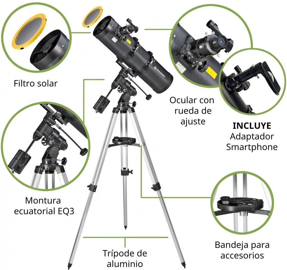 Un gran espejo, con una corta distancia focal, permite la observaci?n de muchos objetos en el cielo nocturno. Con este telescopio de gran campo muy brillante, todos los c?mulos de estrellas y las galaxias pueden ser observados particularmente bien, pero tambi?n la Luna y los planetas se muestran muy detallados. Debido a su corta distancia focal, la longitud del tubo se mantiene corta y por lo tanto el dispositivo sigue siendo muy port?til. Pero tambi?n la mec?nica del BRESSER Pollux es muy poderosa. La montura ecuatorial de alta calidad permite a cada usuario alinear el telescopio perfectamente en poco tiempo. La caracter?stica est?ndar de un telescopio reflector newtoniano es la extensi?n del ocular en el tubo lateral. Esto ofrece una comodidad absoluta al observar con uno de los oculares incluidos. Explora los planetas de nuestro sistema solar y descubre nuevos mundos. .Ahora incluye un filtro solar de alta calidad para la observaci?n segura de manchas solares, eclipses y tr?nsitos planetarios..Con el adaptador de c?mara para Smartphone incluido, puede tomar fotos de sus mejores observaciones a trav?s del telescopio..El BRESSER Pollux tambi?n est? equipado con una gran extensi?n de ocular de 2,0??, que permite el uso de oculares de 2,0?? con campos de visi?n a?n m?s grandes. Con el adaptador de ocular incluido de 2,0?? a 1,25'' tambi?n pueden ser utilizados todos los oculares de 1,25'' . .BRESSER no ha escatimado en gastos y ha equipado al Pollux con un espejo primario parab?lico de alta calidad. Esto ofrece una nitidez de imagen y un contraste mucho mejores que un telescopio comparable con un simple espejo de bola. Adem?s, este telescopio tiene un espejo secundario especialmente grande de 55 mm para una iluminaci?n ideal del campo de imagen..Tenga en cuenta que los telescopios reflectores newtonianos son muy buenos para las observaciones astron?micas del cielo nocturno, pero no muy adecuados para observar la naturaleza y los paisajes durante el d?a. Por lo tanto, para las observaciones de la naturaleza y el paisaje le recomendamos los telescopios refractores BRESSER..NOTA: Si desea un seguimiento autom?tico de las estrellas, puede a?adirle a la montura un motor opcional Art. 4951400..CARACTER?STICAS.Telescopio para la observaci?n nocturna y solar.Sistema ?ptico: Reflector de Newton (espejo primario parab?lico).M?ximo aumento ?til: 300x.Di?metro de la lente del objetivo: 150 mm .Distancia focal: 750 mm .Relaci?n de abertura: f/5 .Gran espejo secundario de 55 mm..Montura: EQ-3.Di?metro ocular: 31,7 mm (1,25"") .Enfocador: 2.0"" con adaptador para un di?metro de 1,25""..Peso total 12,5 kg; Peso del tubo 4,6 kg.INCLUYE.Telescopio con montura.Filtro solar.Oculares: 4mm, 20mm.Buscador LED.Lente Barlow 3x.Adaptador de c?mara para Smartphone.Tr?pode de aluminio .Bandeja de accesorios.Manual de instrucciones