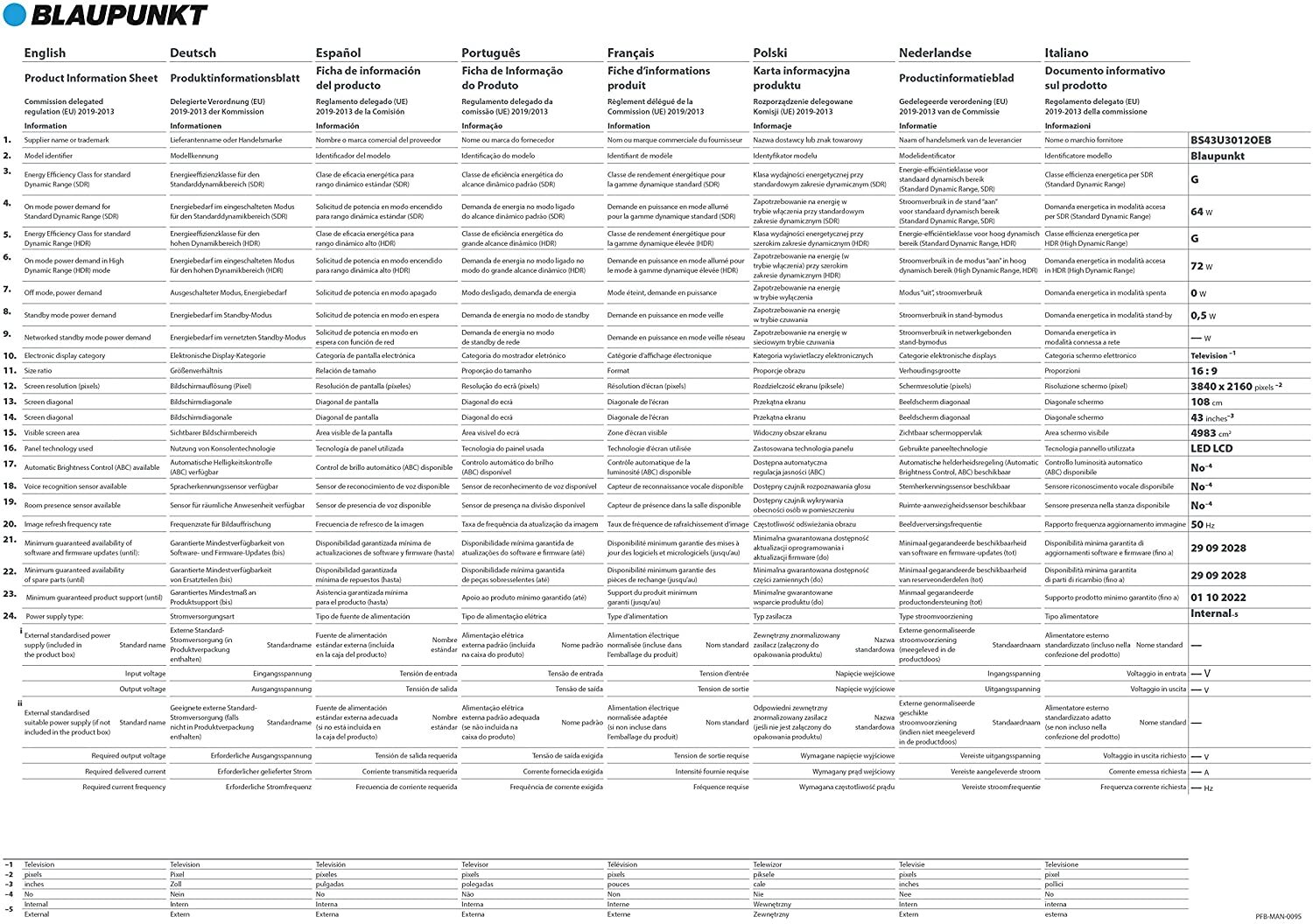 Televisor LED 43 Pulgadas con resolución 3840 x 2160 píxeles (4K ultra HD) Smart TV con WiFi, Miracast, Netflix, YouTube, App Store Conexiones: 3x HDMI, 2x USB, entrada de vídeo compuesto, puerto de interfaz común CI+, salida de audio digital, salida de auriculares; tuner triple DVB-T/T2 & DVB-C & DVB-S2 Reproductor Multimedia USB con codec HEVC (H.265) 10-bit video codec Medidas de soporte de pared: VESA 400x200; Dimensión con peana: 969 x 235 x 618 mm; Dimensión sin peana: 969 x 73 x 566 mm; Peso neto:7kg; Distancia entre peanas: 837mm televisor led 43 pulgadas con resolución 3840 x 2160 píxeles (4k ultra hd) smart tv con wifi, miracast, netflix, youtube, app store conexiones: 3x hdmi, 2x usb, entrada de vídeo compuesto, puerto de interfaz común ci+, salida de audio digital, salida de auriculares; tuner triple dvb-t/t2 & dvb-c & dvb-s2 reproductor multimedia usb con codec hevc (h.265) 10-bit video codec medidas de soporte de pared: vesa 400x200; dimensión con peana: 969 x 235 x 618 mm; dimensión sin peana: 969 x 73 x 566 mm; peso neto:7kg; distancia entre peanas: 837mm Fuente de alimentación: Corded Electric Vataje (W): 64.0 watts Tipo de altavoz: Built-In Configuración del canal de sonido envolvente: 2.0 Número de puertos HDMI: 3 Mostrar más .Especificaciones: .- Marca Blaupunkt.- Resolución 4K.- Año del modelo 2020.- Función especial Internet.- Nombre del modelo Blaupunkt BS43U3012OEB.- Tamaño de pantalla 43 Pulgadas.- Tecnología de pantalla LED.- Tecnología de conectividad USB, HDMI.- Frecuencia de actualización 60 Hz.- Servicios de Internet compatibles Netflix, Amazon Instant Video, Daily Motion, YouTube
