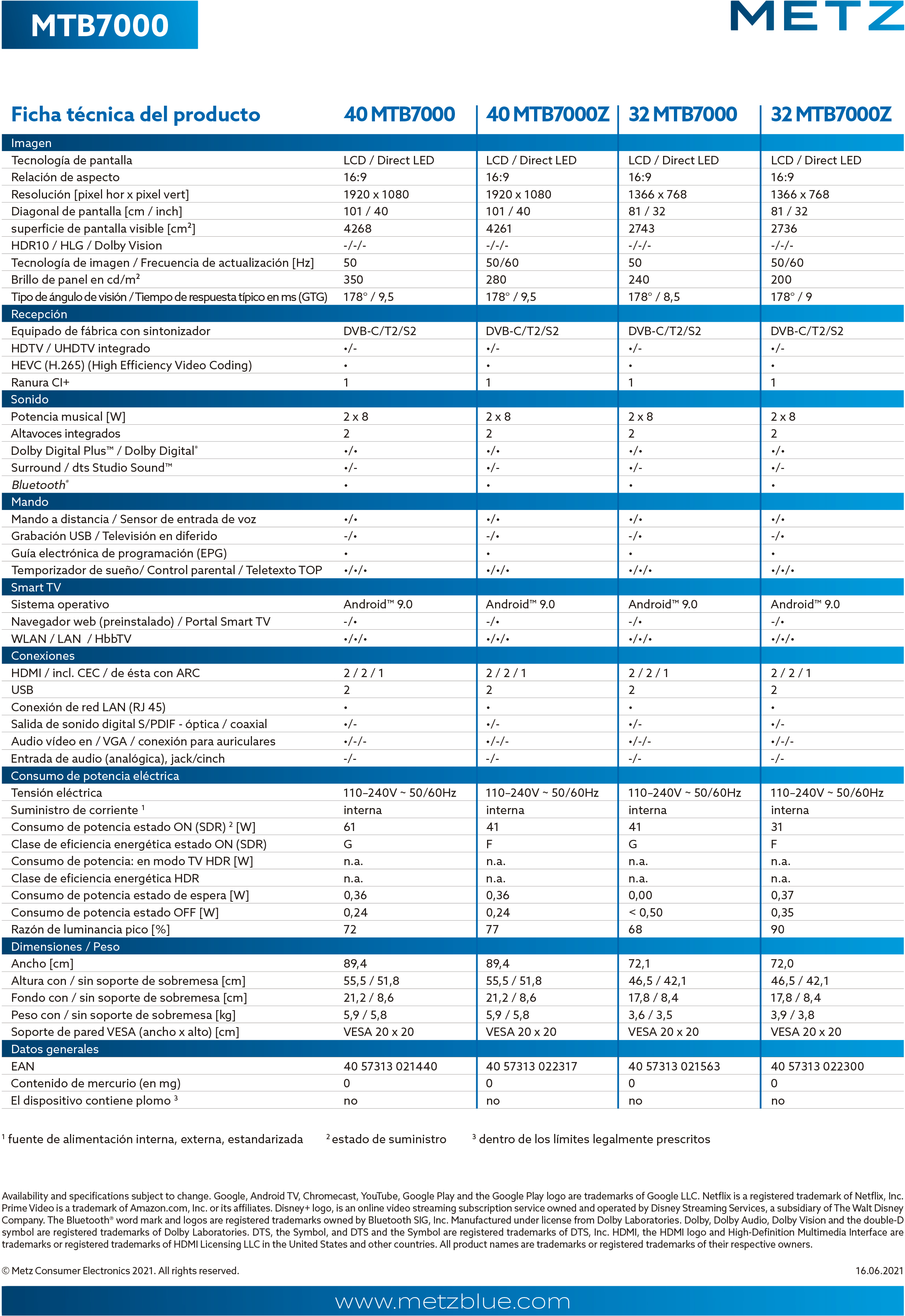 TV Metz 32” MTB 7000 Z. MTB7000 es un televisor LED inteligente con tecnología de pantalla Full HD que lleva a su hogar una diversión televisiva incomparable con Android 9.0. El sencillo diseño se fusiona discretamente en su salón. Disfrute de la libertad de ver lo que quiera en cualquier momento, porque el Smart TV combina una oferta de streaming ilimitada con la comodidad de la televisión clásica. Tanto juegos, deportes, series como películas de éxito: añada fácilmente a través de Google Playstore cualquier otra app compatible con el televisor a los servicios VoD preinstalados como Netflix o Amazon Prime. Un sintonizador triple HD integrado permite la recepción de todos los tipos de recepción habituales, desde televisión por cable (DVB-C) y vía satélite (DVB-S2) hasta terrestre (DVB-T2).
