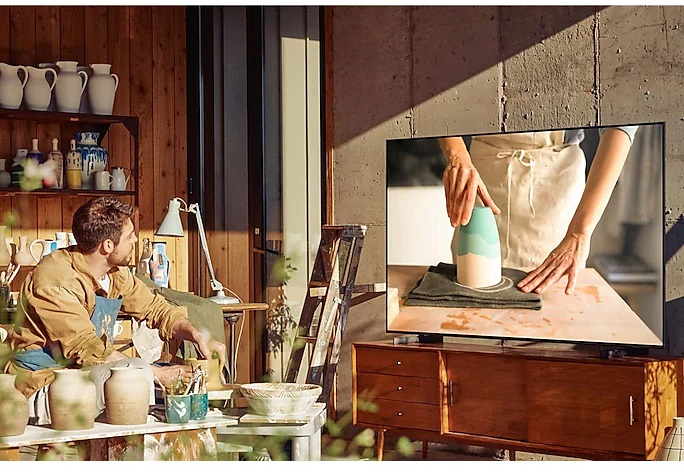 Colores cristalinos en el modelo más elegante\n\nColores realistas en estado puro\nDynamic Crystal Color\nSumérgete en la imagen con el nuevo panel, formado por nanopartículas inorgánicas cristalinas, capaz de reproducir más de mil millones de colores.\n\nPotente calidad de imagen en 4K\nProcesador Crystal UHD\nOptimiza cualquier imagen hasta conseguir una resolución 4K para que no te pierdas ningún detalle, mejorando el color y el alto rango dinámico (HDR).\n\nImágenes más rápidas y fluidas para tomar el control\nMotion Xcelerator Turbo\nDisfruta de un juego ultra fluido sin desenfoques gracias a la mejora de frames (FRC) del nuevo procesador que optimiza las escenas en movimiento hasta 120Hz en 4K. Conquista a todos tus enemigos con una fluidez vertiginosa en tus partidas.\n\nSiente la auténtica resolución 4K UHD\nResolución 4K\nEl televisor 4K UHD consigue 4 veces más píxeles que un Full HD, ofreciendo a tus ojos las imágenes nítidas y claras que se merecen. Ahora puedes ver incluso los pequeños detalles de cada escena.\n\nExperimenta un nuevo nivel de detalle\nHDR+\nEl Alto Rango Dinámico aumenta la gama de niveles de luz de tu televisor para que puedas disfrutar de un enorme espectro de colores y de todos los detalles visuales, incluso en las escenas más oscuras.\n\nTelevisor y barra de sonido en perfecta armonía\nQ-Symphony\nCombina el audio de tu televisor con el de tu barra de sonido creando una atmosfera envolvente a tu alrededor. Disfruta de un sonido multidimensional sin necesidad de conectar altavoces adicionales a tu TV.\n\nUn diseño sin límites\nDiseño AirSlim\nUn diseño nunca antes visto en esta categoría con pantalla ultra fina para que te centres en lo verdaderamente importante: tu película favorita.\n\nAjustado con precisión a la pared\nSoporte de pared Slim\nConsigue el diseño interior minimalista que siempre has deseado. Con el soporte de pared Slim, fácil de instalar, tu televisor se ajusta a la pared para que se integre de forma natural en tu espacio.\n\nDesorden, fuera.\nLa solución para ocultar tus cables.\nOlvídate del amasijo de cables y mantenlos ordenados y escondidos. Dale un aspecto impecable a tu televisor.\n\nAsistentes de voz integrados en tu TV\nElige tu asistente de voz favorito; Bixby, Amazon Alexa o Google Assistant. Todos están integrados en tu televisor Samsung para brindar una experiencia de entretenimiento óptima y sin necesidad de instalar dispositivos adicionales.\n\nDisfruta de tu tiempo viendo, no buscando\nUniversal Guide\nOlvídate de perder el tiempo buscando qué ver. Descubre y accede directamente a una amplia selección de contenidos disponibles en los canales de televisión o en aplicaciones como Movistar+.