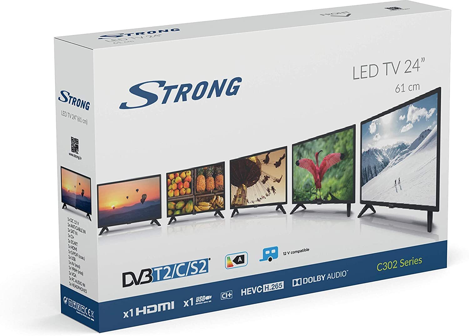 Lo mejor para espacios pequeños!Además de su diseño compacto, la serie C302 convenció por su riqueza de colores, excelente calidade de sonido y numerosas características cómodas. Un puerto USB para la reproducción de archivos, una lista de favoritos para almacenar canales en su orden preferido y la reserva de temporizadores directamente desde la guía de programas en pantalla (EPG) son sólo algunas de ellas. Además, este televisor viene con un sintonizador DVB-T2/C/S2 incorporado y una ranura CI. Disfrute de la televisión como nunca. .Especificaciones: .- Marca Strong.- Resolución 768p.- Año del modelo 2020.- Tipo de montaje Montaje en pared.- Peso del producto 2.7 Kilogramos.- Tamaño de pantalla 24 Pulgadas.- Tecnología de pantalla LED.- Tecnología de conectividad USB, Euroconector, HDMI.- Frecuencia de actualización 60 Hz.- Tecnología del sintonizador DVB-T2