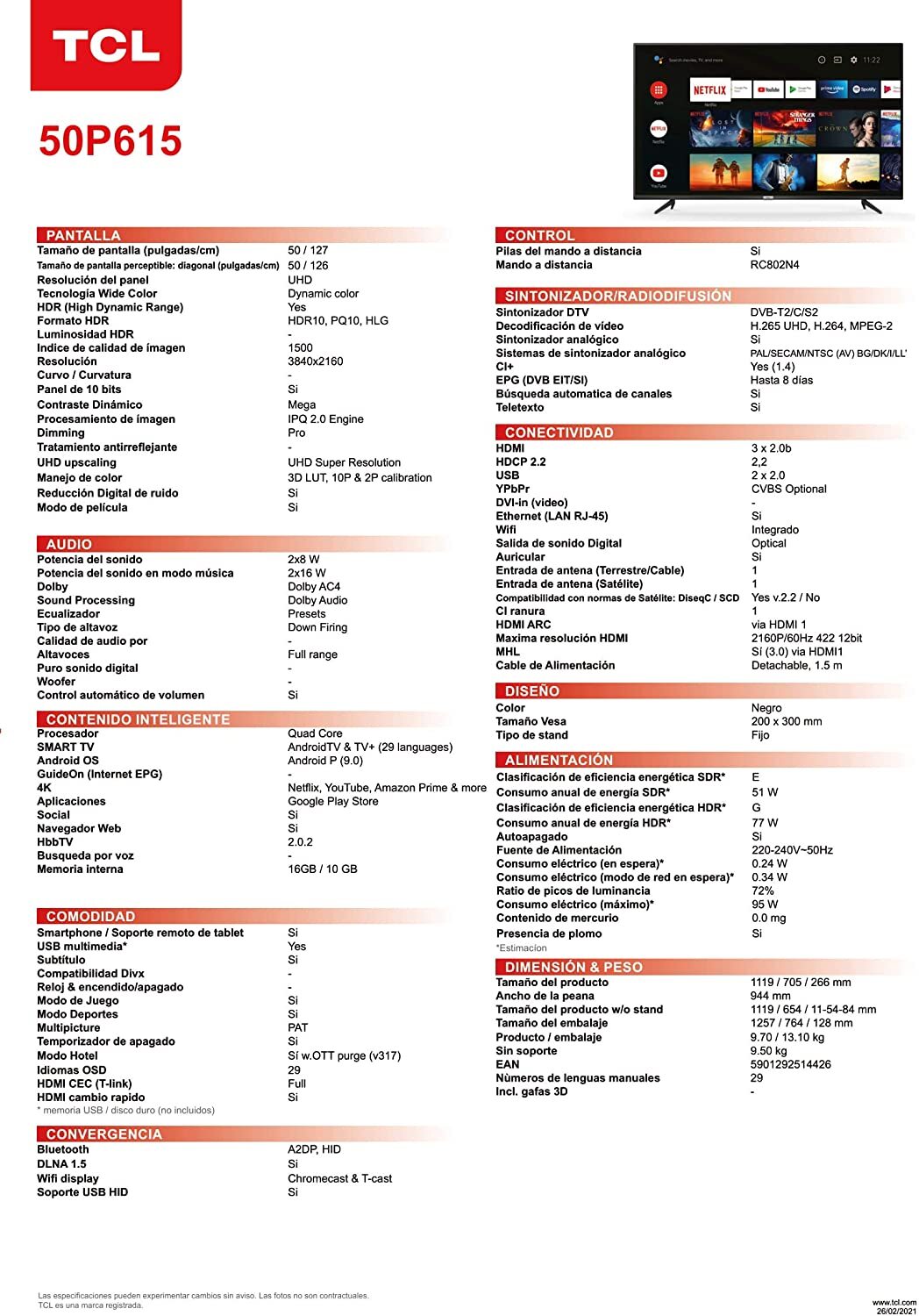Opiniones TCL 50P615 Televisor 50 Pulgadas 4K HDR Android TV Goo