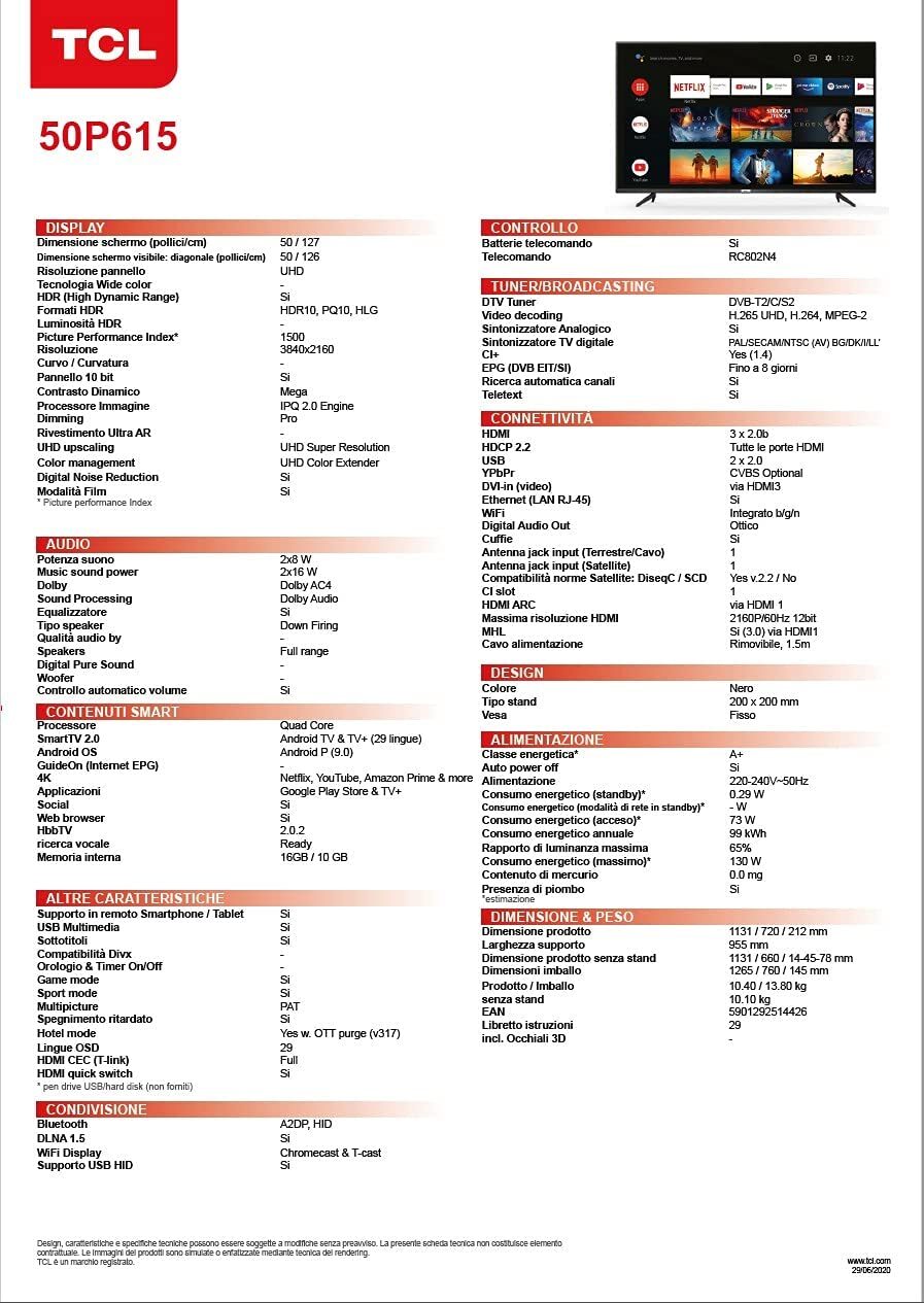 TCL 50P615 Televisor 50 Pulgadas 4K HDR Android TV Goo