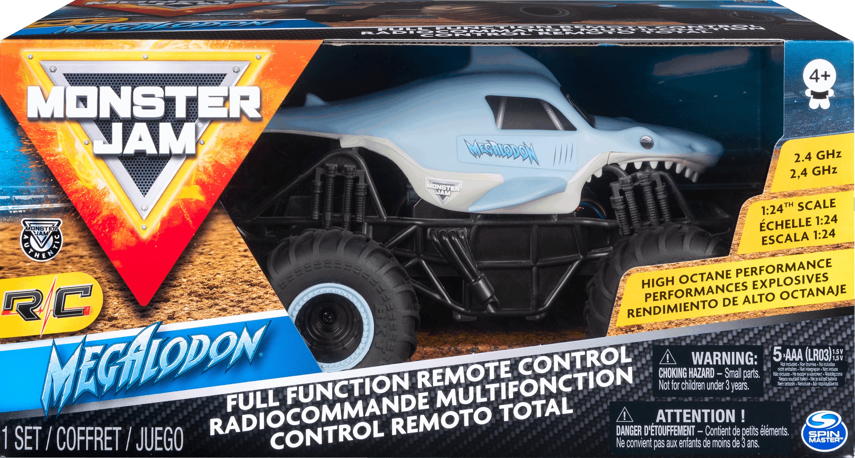 Spin Master 1:24 RC - Megladon, Monster Jam. Tipo: Monster truck, Tipo de motor: Motor eléctrico, Escala: 1:24. Ancho del paquete: 285,7 mm, Profundidad del paquete: 149,4 mm, Altura del paquete: 143 mm. Cantidad por contenedor (20ft): 4304 pieza(s), Cantidad por contenedor (40ft): 8608 pieza(s), Cantidad por palé: 200 pieza(s)