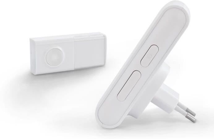 Timbre - Inalámbrico - Alcance hasta 100 m - Se conecta directamente a una toma de corriente - 25 melodías - El pulsador con portaetiquetas no necesita pilas para su correcto funcionamiento - Ya programado y listo para usar.