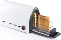 Tunnel Toaster\nTostador de túnel con bandeja de pan deslizante que se adapta a distintos tipos y tamaños de pan. La bandeja también recoge las migas con lo cual facilita la limpieza del tostador. Gracias a la forma del túnel, el tostador tuesta aún mejor.\n\nCon 7 ajustes para adaptarse a sus deseos. Y práctica señal de “listo”.\n\nGracias a la forma del tostador, el calor envuelve el pan.\n\nLa bandeja deslizante con sujeción de pan se adapta a muchas clases de pan.