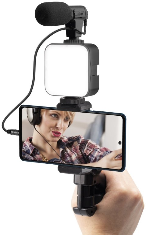 El Kit para hacer retransmisiones en directo se puede desmontar fácilmente en sus componentes. Esto significa que puedes utilizarlo con tres funciones: solo como trípode, solo como LED o utilizando el micrófono por separado.