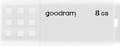 Goodram UME2. Capacidad: 8 GB, Interfaz del dispositivo: USB tipo A, Versión USB: 2.0, Velocidad de lectura: 20 MB/s, Velocidad de escritura: 5 MB/s. Peso: 9 g. Color del producto: Blanco