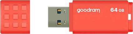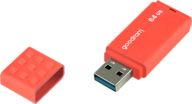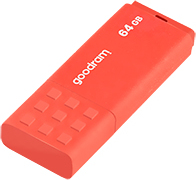 Goodram UME3. Capacidad: 64 GB, Interfaz del dispositivo: USB tipo A, Versión USB: 3.2 Gen 1 (3.1 Gen 1), Velocidad de lectura: 60 MB/s, Velocidad de escritura: 20 MB/s. Factor de forma: Tapa. Peso: 9 g. Color del producto: Naranja