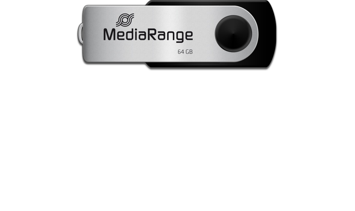 MediaRange 64GB USB 2.0. Capacidad: 64 GB, Interfaz del dispositivo: USB Type-A / Micro-USB, Versión USB: 2.0, Velocidad de lectura: 13 MB/s, Velocidad de escritura: 6 MB/s. Factor de forma: Girar. Peso: 15 g. Color del producto: Negro, Plata