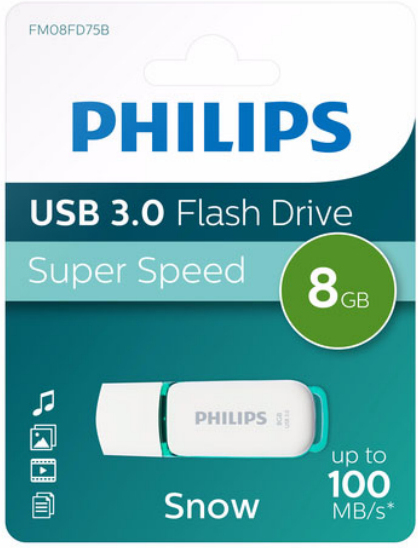 Philips FM08FD75B. Capacidad: 8 GB, Interfaz del dispositivo: USB tipo A, Versión USB: 3.2 Gen 1 (3.1 Gen 1). Factor de forma: Tapa. Peso: 8 g. Color del producto: Turquesa, Blanco