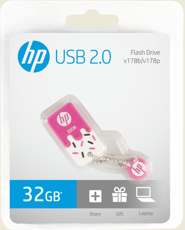 PNY HP v178p 32GB. Capacidad: 32 GB, Interfaz del dispositivo: USB tipo A, Versión USB: 2.0, Velocidad de lectura: 14 MB/s, Velocidad de escritura: 4 MB/s. Factor de forma: Tapa. Peso: 8,1 g. Color del producto: Rosa, Blanco