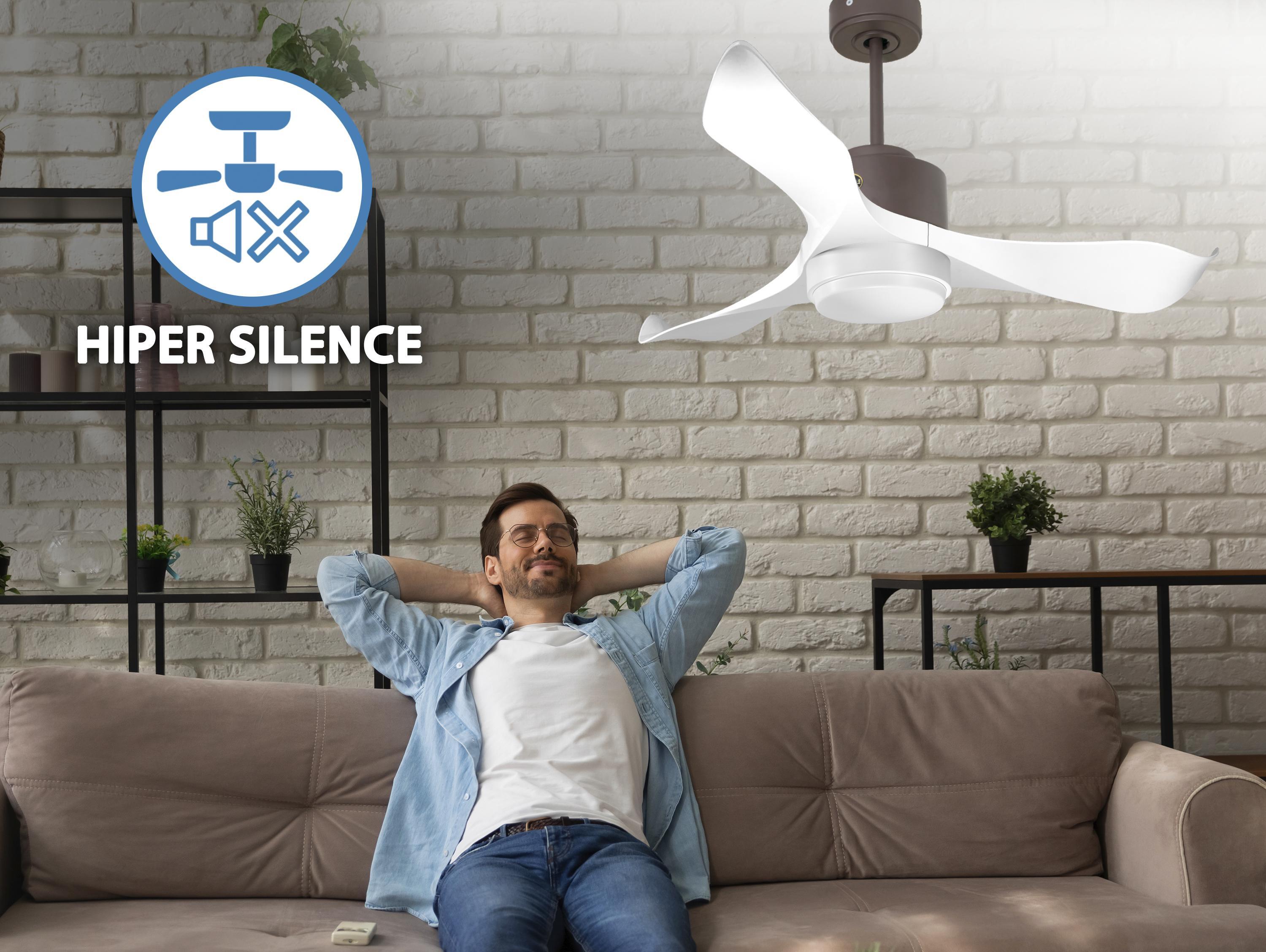 El motor de corriente continua DC6 en negro permite instalaciones en techos de hasta 27º de inclinación y se sirve con dos tijas para que se instale a la altura adecuada (13.5 cm y 25 cm). Es perfecto para 2 o 3 aspas, pues dispone de una función de auto equilibrado. Además admite kit de luz. Este modelo es reversible, desestratificador de aire, de forma que en invierno podrás invertir sus palas para que su movimiento desplace el aire caliente hacia abajo, actuando como complemento de tu sistema de calefacción y favoreciendo un consumo optimizado. Además incluye un termostato en su base, por lo que lo podrás programar para que el ventilador funcione según la temperatura ambiente.Entre su multitud de ventajas incluye 6 velocidades, temporizador (8h) y posibilidad de control remoto mediante mando a distancia, mando de pared y conexión WiFi con la aplicación Tuya Smart, para poder utilizar el ventilador desde cualquier dispositivo móvil. Cuenta también con sistema HYPERSILENCE, una tecnología súper silenciosa que nunca sobrepasa los 38dB a velocidad 3 y que permite utilizar el ventilador por las noches o en momentos de descansos, ofreciendo un rendimiento muy silencioso y con un consumo máximo de 38 W.Como extra, tiene Función Memoria que permite guardar la configuración utilizada, tanto en velocidad como en luz, de modo que al apagar el ventilador queda guardada y al volver a encenderlo se inicia con la misma configuración.Las palas aerodinámicas de ABS otorgan al ventilador una gran ligereza. Han sido artesanalmente tratadas para estar equilibradas y no producir ningún tipo de vibración. Este modelo de 3 aspas en color blanco tiene un diámetro de 106 cm y alcanza gran velocidad.El kit de luz L1WI optimizará todas sus posibilidades de tu ventilador. Este formato en color blanco ofrece 3 colores diferentes.