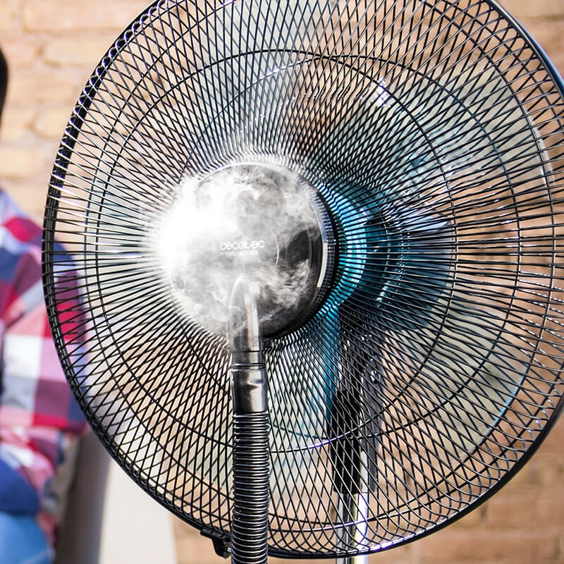 ForceSilence 590 FreshEssence\nVentilador nebulizador de pie con agua pulverizada. Muy potente. 3 L. Oscilante. Silencioso. 3 velocidades. 5 aspas. Temporizador. Regulable. Motor de cobre. ForceSilence 590 FreshEssence de Cecotec.\nFreshEssence: tecnología nebulizadora que refresca el ambiente con micropartículas de agua para que disfrutes de un olor agradable y el máximo confort.\nForceSilence Technology: consigue una profunda sensación de aire fresco al instante. Totalmente silencioso.\nAirFlow5: tecnología formada por 5 aspas de gran diámetro de 40 cm para garantizar el máximo caudal de aire fresco de la forma más eficiente. Máximo frescor con el mínimo consumo.\n3 L Capacity: gracias a su tanque de gran capacidad de 3 l consigue hasta 12 horas de autonomía de vapor de agua, para disfrutar de los mejores ambientes durante todo el día.\nCopperEngine: exclusivo motor 100 % de cobre de alta eficiencia, fiabilidad y de máxima durabilidad. Alarga la vida útil del ventilador y evita incidencias y averías no deseadas gracias al sistema de seguridad TermoSafe.\n3Speed Function: podrás elegir entre 3 velocidades de funcionamiento (baja-Noche, media-Eco y alta-Turbo) para adecuar la intensidad del caudal de aire a tus necesidades.\nAdjustable Mist: adapta de forma independiente el vapor de agua para crear diferentes ambientes en tu hogar o terraza.\nCoolTimer: dispone de temporizador programable hasta 120 min transcurridos los cuales el ventilador se apaga de forma automática, para proporcionarte la máxima comodidad durante su uso y ahorrar energía.\nRotateWind: modo en el que las aspas oscilan para proporcionar un mayor ángulo de aireación y ofrecer una amplia zona de frescor.\nTotalControl: permite seleccionar el ángulo de incidencia del flujo de aire.\nSecuritySystem: sistema de seguridad integral formado por los siguientes elementos: Rejilla de seguridad que impide el acceso a las aspas.\nAspas fabricadas en material semiblando AS para mayor seguridad.\nBase robusta y estable de gran superficie para garantizar una total estabilidad.\nMinimalDesign: dispone de un diseño minimalista muy cuidado, con líneas elegantes que se adaptan a tu hogar y lo convierten en un elemento de decoración idóneo en las épocas de calor.\nHealth&Safety: el ventilador cumple con la normativa vigente en cuanto a seguridad y protección del medio ambiente, para que cuides de los tuyos y de tu entorno.\nEasy to move: fácil de transportar y almacenar gracias a sus ruedas.