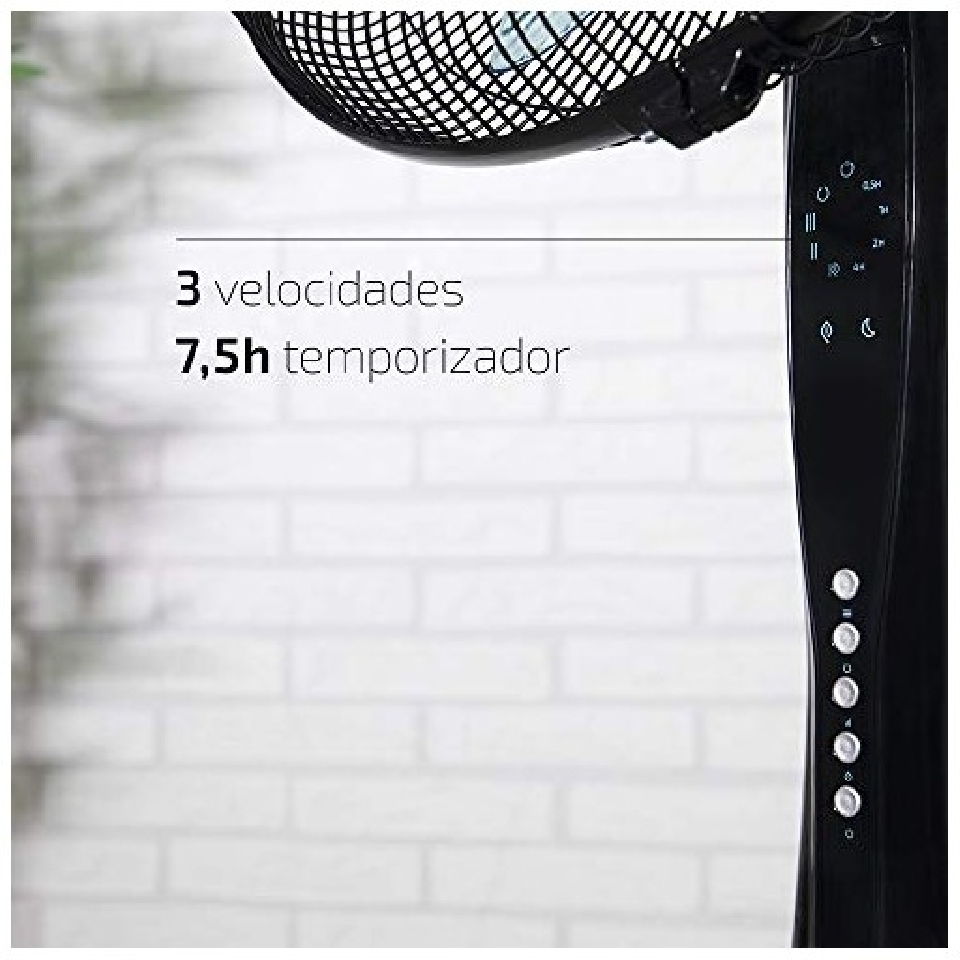 Gran potencia de 50 W que facilita la ventilación de la estancia que junto con su motor de cobre aporta una gran calidad, eficiencia y durabilidad al ventilador, además de colaborar en su proceso de ventilación..Las 16 pulgadas del ventilador, equivalentes a 40 cm, le aportan un gran diámetro que potencia la salida del flujo de aire junto con sus 5 aspas..Control inteligente gracias a su mando a distancia y su panel con indicador LED, en el cual podrás visualizar la configuración seleccionada..Posee 3 velocidades y 3 modos (Normal, Nature, Sleep) que permiten regular la intensidad del flujo del aire en función de las necesidades de cada momento. .Temporizador programable un máximo de 7,5 horas que permite seleccionar el tiempo de funcionamiento deseado y tras el mismo el ventilador se apagará..Oscilación automática que facilita la distribución del aire fresco en la estancia en la cual sea ubicado..EnergySilence Technology: consigue una profunda sensación de aire fresco al instante con el máximo silencio y confort..Altura e inclinación regulable de 110 a 130 cm para conseguir un gran flujo de aire y hacia la dirección deseada.