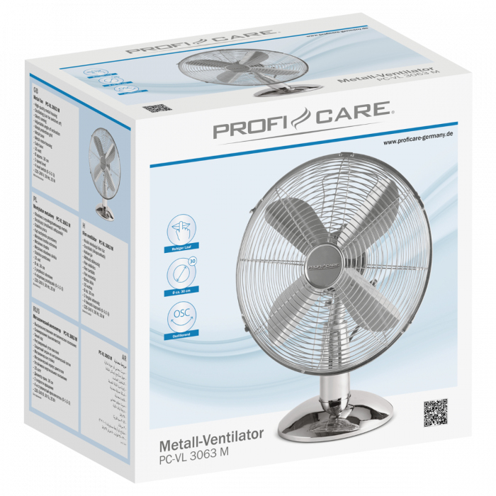 ProfiCare PC-VL 3063 M. Tipo: Ventilador con aspas para el hogar, Color del producto: Cromo, Ubicación: Piso, Mesa. Alimentación: Corriente alterna, Consumo energético: 35 W, Voltaje de entrada AC: 220-240 V. Ancho: 335 mm, Profundidad: 250 mm, Altura: 420 mm
