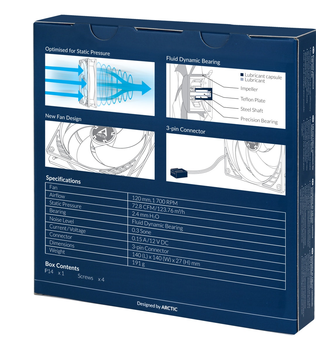 ARCTIC P14. Adecuado para: Carcasa del ordenador, Tipo: Enfriador, Diámetro de ventilador: 14 cm. Color del producto: Negro, Número de ventiladores: 1 Ventilador(es). Conector de ventilador: 3 pines. Voltaje: 12 V, Voltaje de arranque: 2,1 V, Intensidad nominal: 0,15 A. Ancho: 140 mm, Profundidad: 140 mm, Altura: 27 mm