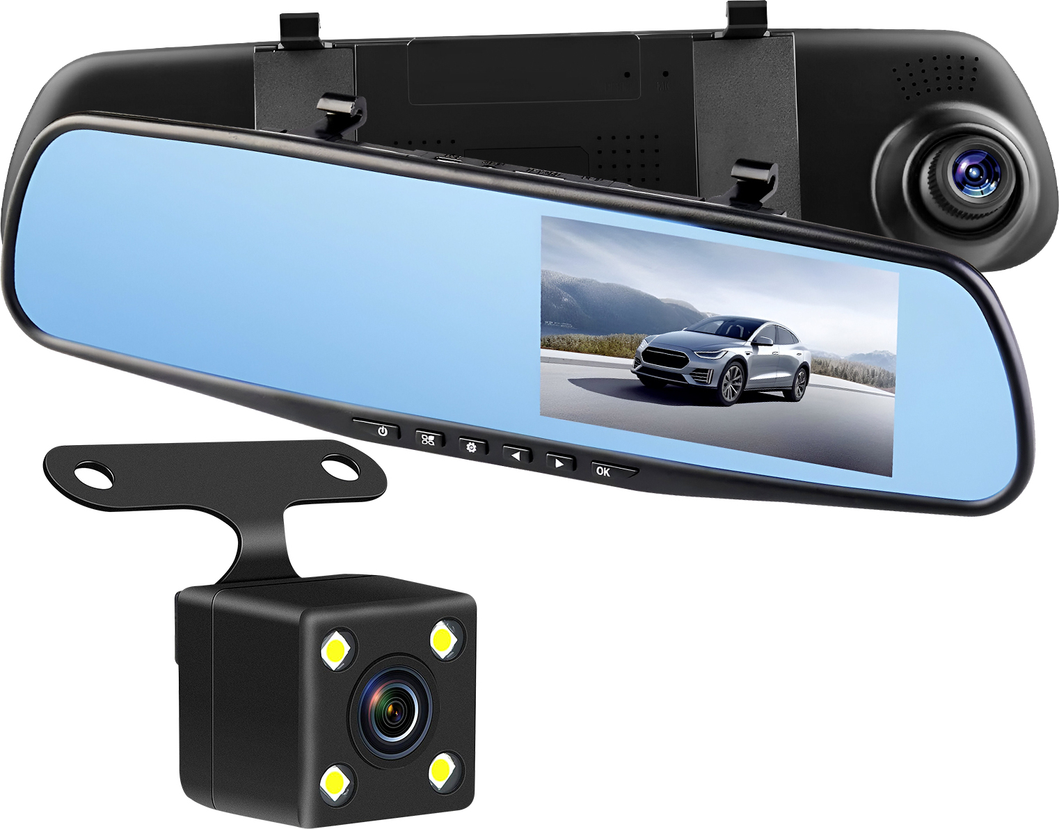 DVR-01 cámara de espejo retrovisor a bordo. Dashcam con cámara frontal de 170° y trasera de 120°. Sensor G, lentes gran angular, gran apertura y WDR. Pantalla TFT en color de 5'' con captura de imágenes HD 1080p / Micrófono integrado. Vigilancia las 24 horas.Características y Puntos fuertes: La dashcam para coche con soporte integrado para espejo retrovisor le permite capturar y grabar su viaje en carreteraEl sensor G integrado detecta automáticamente situaciones de emergencia, como frenazos bruscos o colisiones, y bloquea las imágenes para evitar que se sobrescriba el vídeo.La grabación en bucle permite el uso continuo de la cámara a la vez que optimiza el espacio de almacenamientoLa cámara trasera incluida proporciona una vigilancia completa de la parte trasera del vehículo, ideal para las maniobras de marcha atrás.