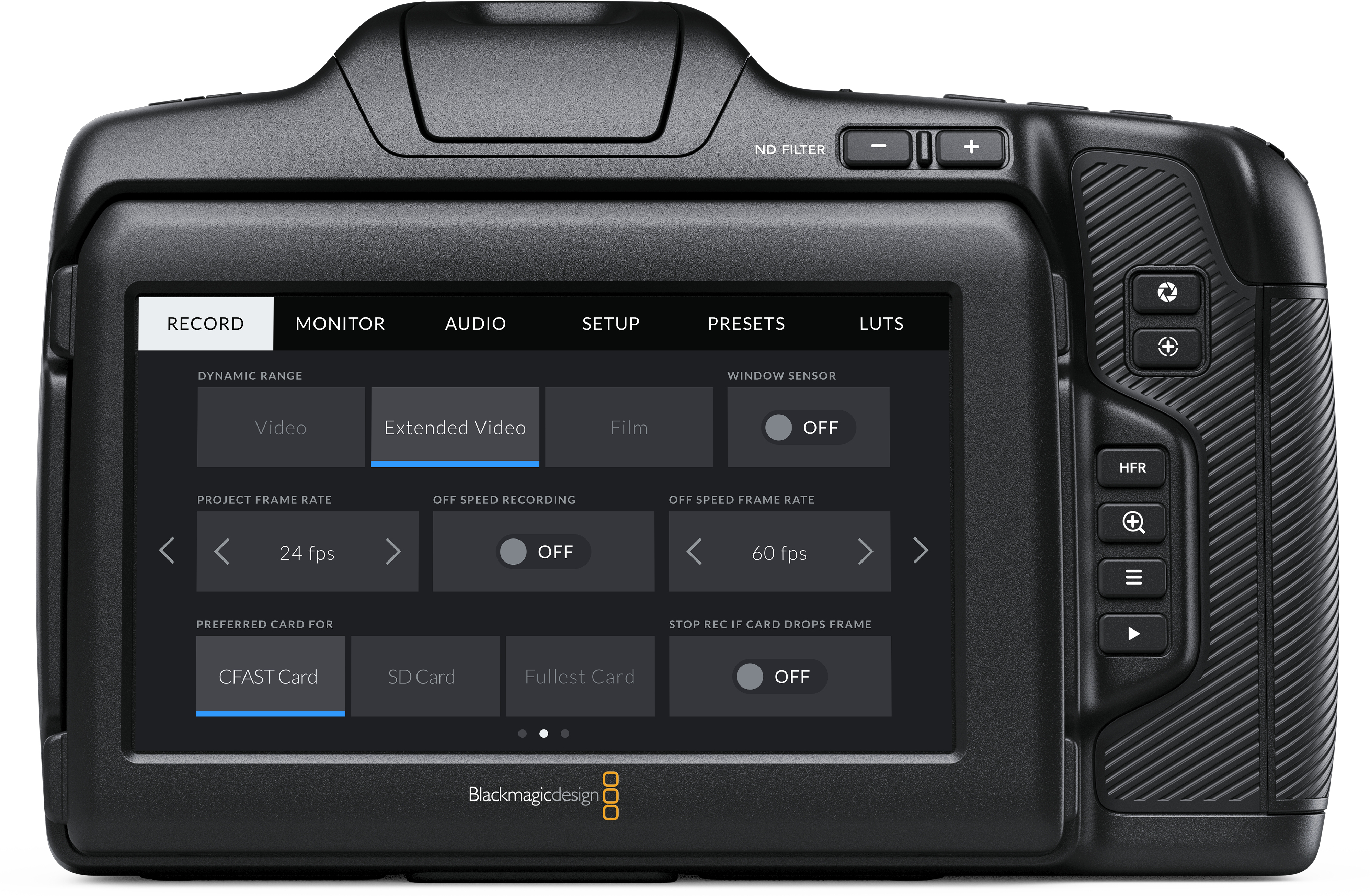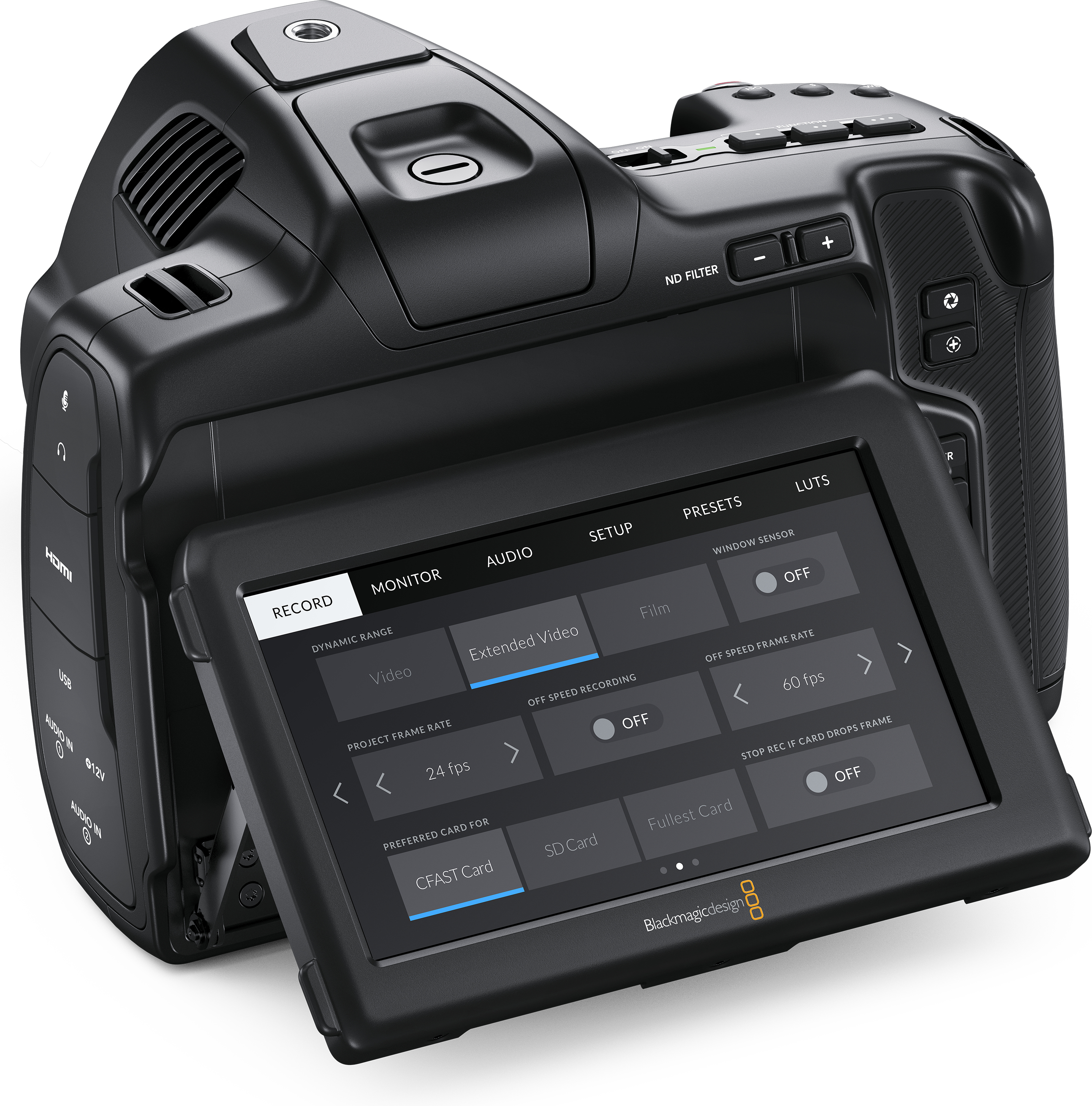 Blackmagic Design 6K Pro. Interfaz de montaje del objetivo: Canon EF. Tipo de media del camcorder: Tarjeta de memoria, Tarjetas de memoria compatibles: CFast 2.0, SD. Sensibilidad ISO: 400, 3200. Diagonal de la pantalla: 12,7 cm (5""), Pantalla: LCD, Resolución de la pantalla: 1920 x 1080 Pixeles. Cámara de vídeo portátil: Videocámara manual, Relaciones de aspecto compatibles: 2.4:1, 16:9, 17:9
