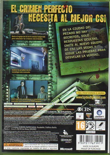 CSI: Determinación Mortal (xbox 360).Fecha de lanzamiento: 12 de septiembre de 2009.EL CRIMEN PERFECTO NECESITA EL MEJOR CSI.En la ciudad del pecado no hay secretos, sólo respuestas ocultas. Unete al nuevo equipo de CSI LAS VEGAS, sigue las pruebas para desvelar la verdad y lleva a los culpables ante la ley..Características:.Cinco sorprendentes casos a investigar..Acciones: Explorar los escenarios de los crímenes, realiza autopsias, interrogar a testigos y sospechosos, analizar las pruebas (análisis de ADN, análisis al microscopio, huellas...) y mucho más.