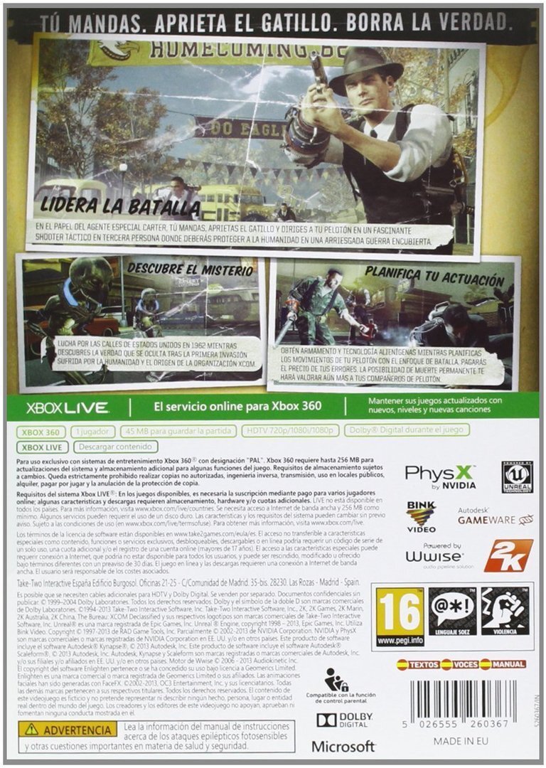 The Bureau: Xcom Desclassifiel (XBOX 360).Desarrollador:.2K Marin.Editor:.Take 2.Género:.Acción, Acción y aventura, Acción táctica (Ciencia ficción).Jugadores:.1.Idioma:.Textos en español y voces en español. .Lanzamiento:.23 de agosto de 2013 (Pegi: +16)