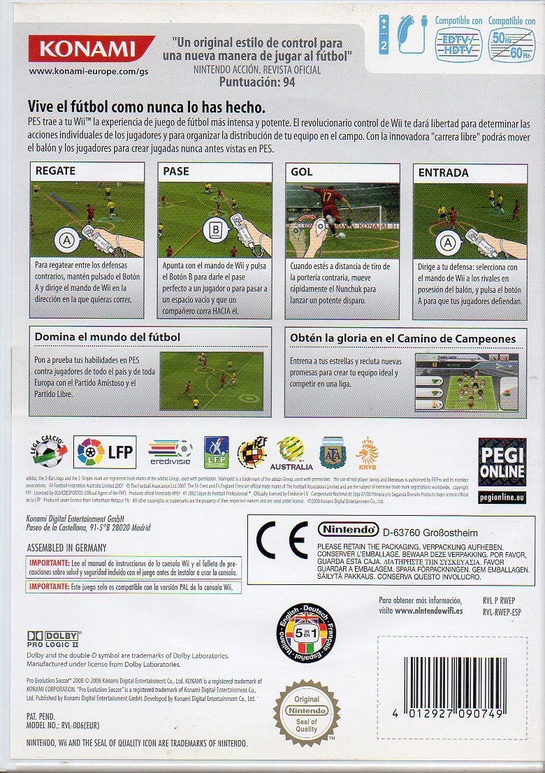 Pro evolution soccer 2008 (Wii)(de segunda mano muy bueno).VIVE EL FÚTBOL COMO NUNCA LO HAS HECHO..-PES trae a tu Wii la experiencia de juego de fútbol más intensa y potente. El revolucionario control de Wii te dará libretad para determinar las acciones individuales de los jugadores y para organizar la distribución de tu equipo en el campo. Con la innovadora ""carrera libre"" podrás mover el balón y los jugadores para crear jugadas nunca vistas en PES..Desarrollador:. Konami.Editor:. Konami.Género:. Deportes, Fútbol.Jugadores:. 1-2, 2 online.Lanzamiento:. 27 de marzo de 2008