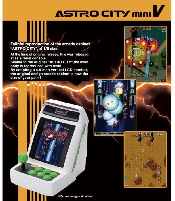 Retrogaming-Tras el lanzamiento del Astro City Mini que marcó el 60 aniversario de la marca, Sega te ofrece una nueva versión alternativa de su mítico terminal arcade: el Sega Astro City V. V para ""Vertical"" -Está equipado con un 4.6- pantalla de una pulgada y llevará 22 juegos, Vertical shoot'Em Ups por supuesto!.