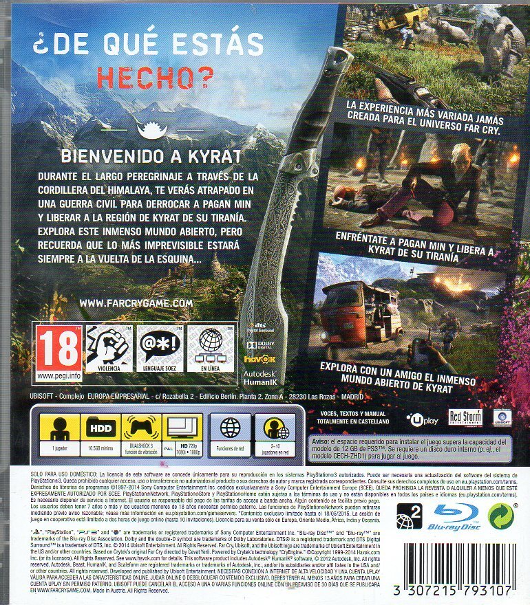 Far cry 4 (ps3) (de segunda mano muy bueno).¿DE QUÉ ESTÁS HECHO?.BIENVENIDO A KYRAT.DURANTE EL LARGO PEREGRINAJE A TRAVÉ DE LA CORDILLERA DEL HIMALAYA, TE VERÁS ATRAPADO EN UNA GUERRA CIVIL PARA DERROCAR A PAGAN MIN Y LIBERAR A LA REGIÓN DE KYRAT DE SU TIRANÍA. EXPLORA ESTE INMENSO MUNDO ABIERTO, PERO RECUERDA QUE LO MÁS IMPREVISIBLE ESTARÁ SIEMPRE A LA VUELTA DE LA ESQUIFA....-Requiere disco duro de más de 20GB.-El contenido adicional puede estar descargado o no disponible !!!.Idioma: Español.Subtítulos: Castellano.Manual: Castellano