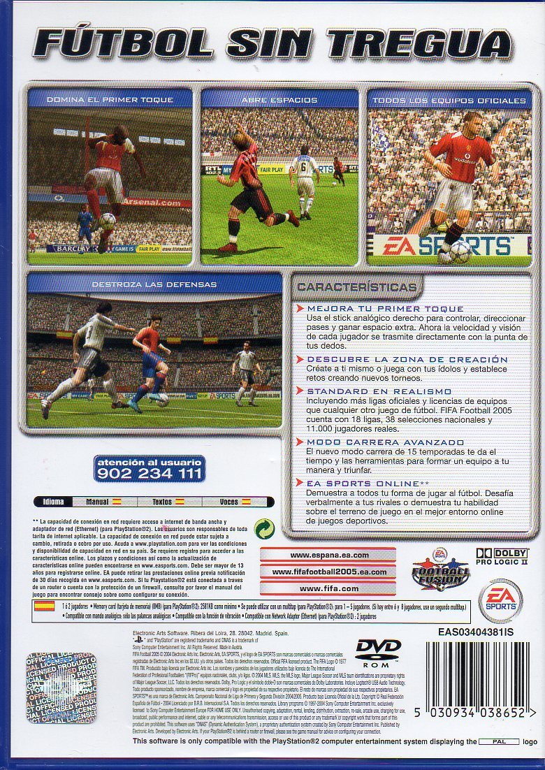 FIFA Football 2005 (ps2) (de segunda mano muy bueno).CARACTERÍSTICAS:.-MEJORA TU PRIMER TOQUE.Usa el stick analógico derecho para controlar, direccionar pases y ganar espacio extra. Ahora la velocidad y visión de cada jugador se trasmite directamente con la punta de tus dedos..-DESCUBRE LA ZONA DE CREACIÓN.Créate a ti mismo o juega con tus ídolos y establece retos creando nuevos torneos..-STANDARD EN REALISMO.Incluyendo más ligas oficiales y licencias de equipos que cualquier otro juego de fútbol. FIFA Football 2005 cuenta con 18 ligas, 38 selecciones nacionales y 11.000 jugadores reales..-MODO CARRERA AVANZADO.El nuevo modo carrera de 15 temporadas te da el tiempo y las herramientas para formar un equipo a tu manera y triunfar..-EA SPORTS ONLINE"".Demuestra a lodos tu forma de jugar al fútbol. Desafía verbalmente a tus rivales o demuestra tu habilidad sobre el terreno de juego en el mejor entorno online de juegos deportivos.