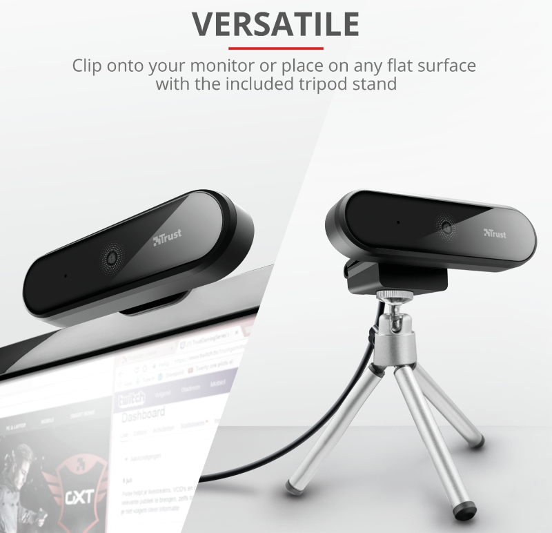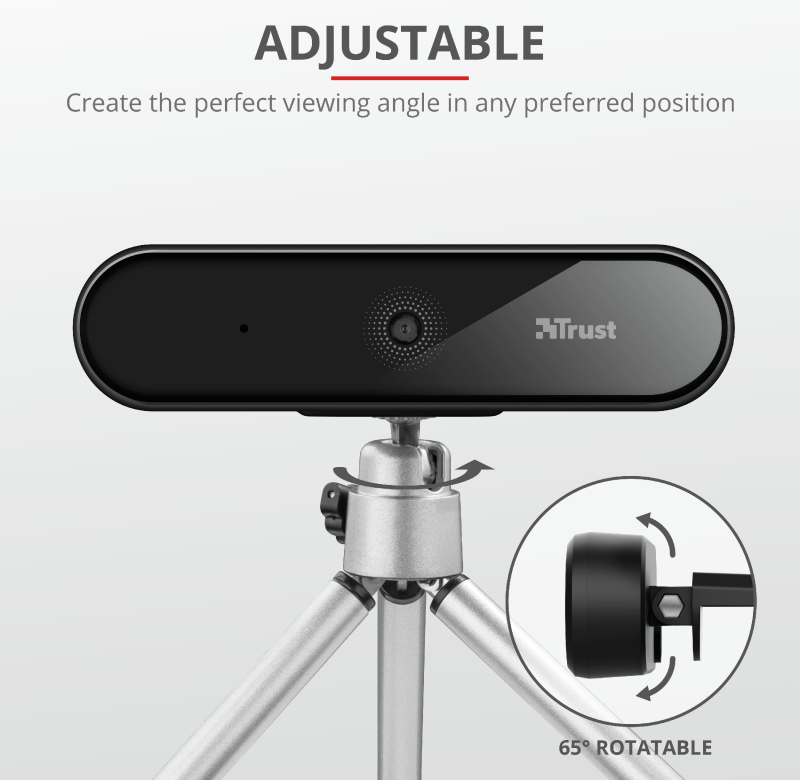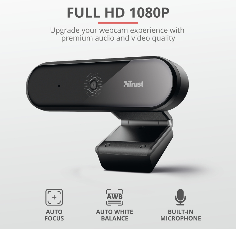Teleconferencias cómodas\n\n¿Se imagina no tener que sufrir más teleconferencias incómodas, con poca iluminación y sonido distorsionado? En este momento en el que desea poder conectarse de la mejor manera posible a través de vídeo, la cámara web Tyro Full HD de Trust ofrece la solución, ya que incorpora en un solo dispositivo todas las funciones para agilizar las videollamadas y la transmisión de vídeo.\n\nLa mejor imagen y el mejor sonido\n\nCon una calidad de audio y vídeo de primera calidad, tenga la seguridad de poder contar con la mejor imagen y un sonido excelente en todas las llamadas y secuencias de vídeo, independientemente de dónde se encuentre. El objetivo gran angular con resolución Full HD 1080p y el enfoque automático garantizan un vídeo de gran precisión, mientras que el equilibrio de blancos automático ofrece un rendimiento excepcional en condiciones de poca luz, para conseguir un vídeo nítido en cualquier situación.\n\nFácil de usar\n\nGracias a la configuración Plug & Play, las videollamadas nunca han sido tan sencillas; una vez que se conecta el receptor USB al PC o portátil, se puede empezar la conferencia de inmediato. La cámara web Tyro Full HD de Trust funciona con Zoom, Teams, Skype y otros programas de videollamada. La cámara web se acopla fácilmente al monitor, descansa estable sobre un escritorio y también incluye un trípode, haciendo que este práctico dispositivo sea lo suficientemente versátil para adaptarse a cualquier espacio de oficina o de despacho en casa.