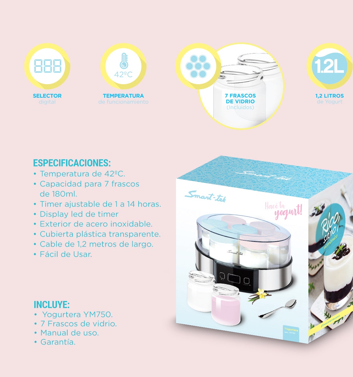 Yogurtera Smart-Tek YM750? Máquina para hacer yogur casero. Elabora de manera casera y natural tus propios yogures del sabor y textura que más te guste. Ideal para familias, de esta manera no consumirás conservantes ni ingredientes artificiales, además de controlar los gastos y la generación de residuos, colaborando con el medio ambiente. El temporizador digital te permitirá programar el tiempo de preparación deseado a través de la pantalla LED.Su cubierta de acero inoxidable de elegante diseño será el nuevo accesorio que no podrá faltar en tu cocina. Sus materiales nobles y robustos cumplen todas las certificaciones estándar CE, GS, DGCCRF entre otras, además de ser libre de BPA 100%.Los tarros y tapas incluidos para almacenar pueden ser lavados en lavavajillas. ? Especificaciones Técnicas:Exterior de acero inoxidableCubierta plástica transparenteCable de 1.2 metros de largoVoltaje: 220-240 VCapacidad por frasco: 0.18 lt? La caja incluye:1 x yogurtera Smart-Tek7 x frascos de cristal1 x manual de instrucciones en español.